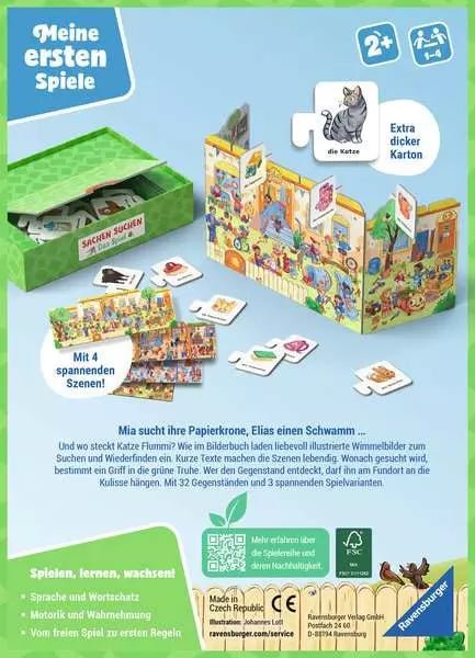 In diesem Spiel entdecken Kinder liebevoll gestaltete Szenen, in denen verschiedene Gegenstände versteckt sind. Wie aus den bekannten Bilderbüchern wählen die Kinder aus einer Truhe zufällig ein Suchmotiv aus und machen sich auf die Suche nach dem passenden Platz in der Spielszene. Der gefundene Gegenstand wird direkt an der richtigen Stelle befestigt.