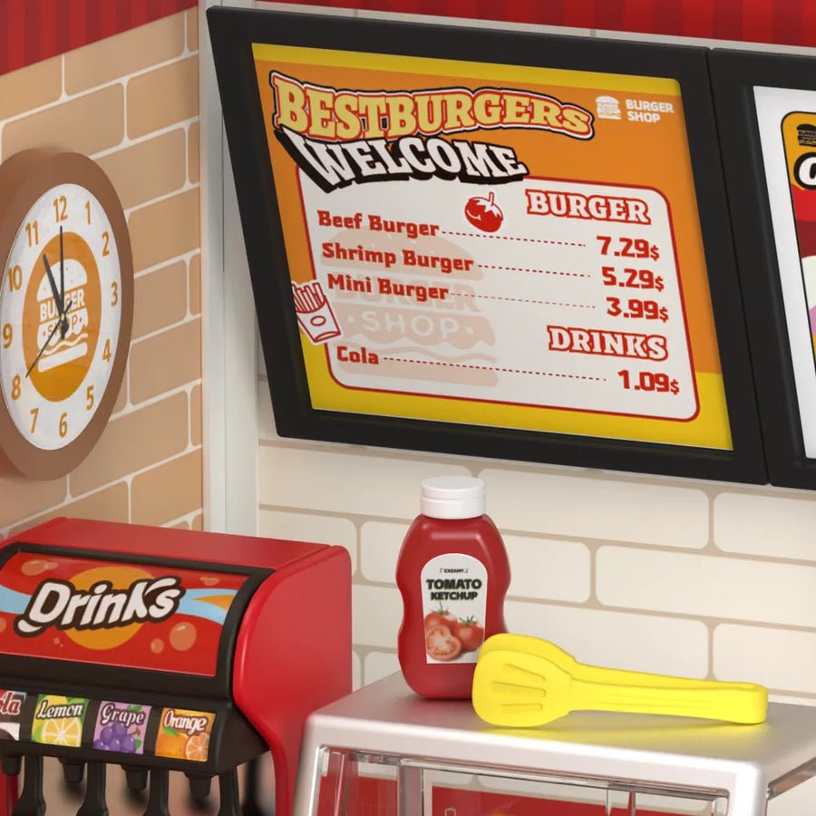 Miniatur-Fastfoodladen mit Theke, Sitzbereich, Burgern, Pommes und Getränken