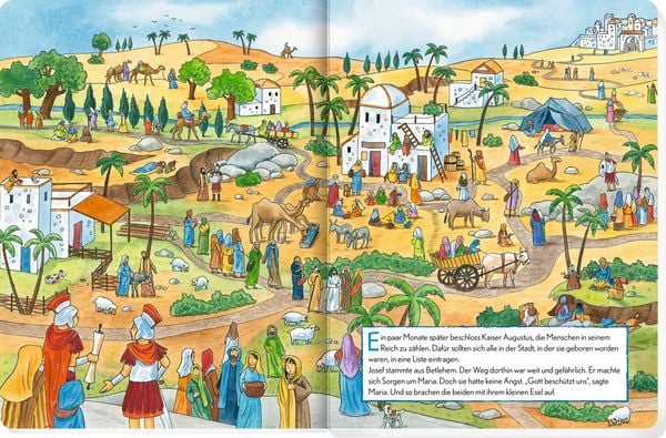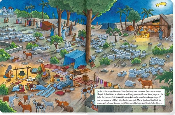 Das Buch „Meine erste Wimmel-Weihnachtsgeschichte“ lädt Kinder ab 2 Jahren dazu ein, die biblische Weihnachtsgeschichte nach Matthäus und Lukas spielerisch zu entdecken. In 6 detailreichen, farbenfrohen Wimmelbildern und mit einfachen Vorlesetexten wird die Geburt des Jesuskindes kindgerecht nacherzählt. Das hochwertige Pappbilderbuch mit Goldfolie auf dem Cover verbindet spannende Suchbilder mit kurzen Erzählungen und macht die Weihnachtsgeschichte für kleine Kinder anschaulich erlebbar. Perfekt für gemütliche Vorlesemomente im Advent, als Geschenk im Nikolausstiefel oder unter dem Weihnachtsbaum.