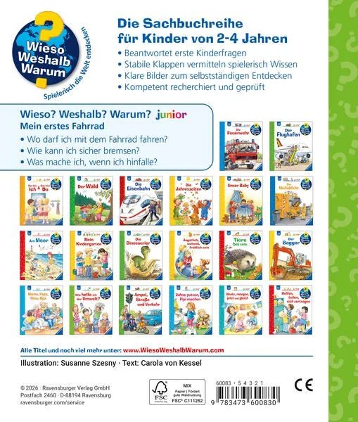 Wieso? Weshalb? Warum? junior – Mein erstes Fahrrad begleitet Kinder behutsam auf dem Weg zum Radfahren. Dieses Kinderbuch ab 2 Jahren beantwortet typische Fragen: Wie lerne ich Fahrrad fahren? Warum brauche ich einen Helm? Was passiert, wenn ich hinfalle? Schritt für Schritt erleben Kinder, wie das Rad ausgesucht wird, wie Bremsen funktioniert und wie erste Fahrversuche gelingen.