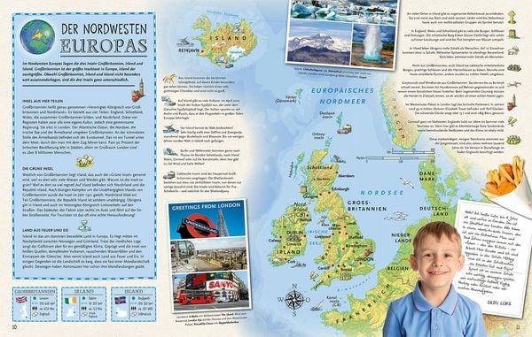 Zusätzliche Übersichts- und Themenseiten erklären wichtige Zusammenhänge wie Klima, Vulkane oder politische Strukturen in Europa. Rekorde, Besonderheiten und ungewöhnliche Fakten sorgen für Abwechslung und vertiefen das Verständnis für geografische Themen.