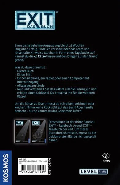 EXIT – Das Buch: Tagebuch der Ewigkeit ab 14 Jahren bildet den Abschluss der anspruchsvollen EXIT-Profi-Reihe. Im Mittelpunkt steht ein rätselhaftes Tagebuch, dessen Geheimnis sich nur durch logisches Denken, genaues Lesen und konsequentes Kombinieren lüften lässt.