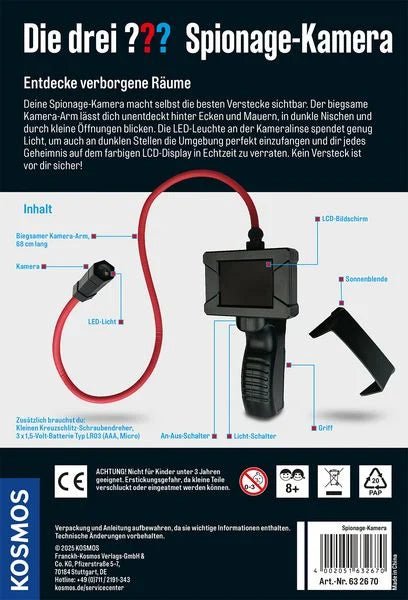 Mit dieser Spionage-Kamera begeben sich Kinder auf Entdeckungstour wie Justus, Peter und Bob. Ein biegsamer Kamera-Arm ermöglicht es, hinter Mauern, um Ecken oder durch kleine Öffnungen zu schauen. Selbst schwer zugängliche oder dunkle Stellen lassen sich so erkunden und sichtbar machen.