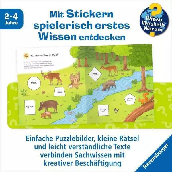 Mit dem Wieso? Weshalb? Warum? junior Stickerheft – Tiere im Wald gehen schon die Kleinsten auf Entdeckungstour. In großen, farbenfrohen Szenen begegnen Kinder ab 2 Jahren Reh, Wildschwein, Eule und vielen weiteren Waldbewohnern. Über 150 Sticker laden dazu ein, Szenen kreativ zu gestalten, Tierbabys ihren Familien zuzuordnen und die Behausungen der Tiere zu vervollständigen.