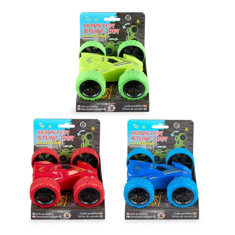 Das Speed Stunt-Auto mit Überschlag-Funktion sorgt für rasante Action im Kinderzimmer. Das robuste Offroad-Design macht jeden Stunt mit – einfach anschieben und schon überschlägt sich das Auto spektakulär und fährt direkt auf der anderen Seite weiter. Ideal für kleine und große Actionliebhaber, die schnelle Fahrzeuge und wilde Manöver lieben. Die handliche Größe macht das Auto perfekt für unterwegs und bietet langlebigen Spielspaß dank stabiler Verarbeitung. Ein spannendes Actionfahrzeug, das Bewegungsfreude, Neugier und Fantasie fördert und für viele Überraschungsmomente sorgt.