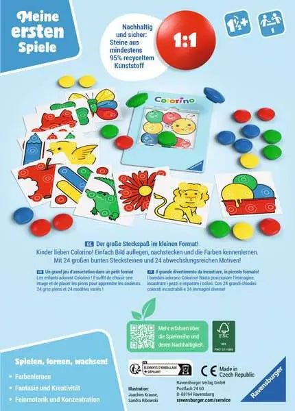 Mein erstes Colorino arbeitet mit großen, griffigen Stecksteinen, die sich leicht aufnehmen und einsetzen lassen. Beim Nachstecken der Vorlagen lernen Kinder spielerisch die Grundfarben kennen und üben gezielte Handbewegungen. Fortgeschrittene Motive enthalten mehrere Farben und einfache Formen, wodurch das genaue Hinschauen und Vergleichen gefördert wird. Das Spielmaterial ist übersichtlich gestaltet und auf wiederholtes, selbstständiges Spielen ausgelegt.