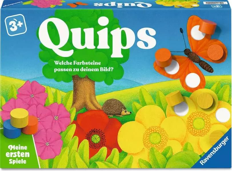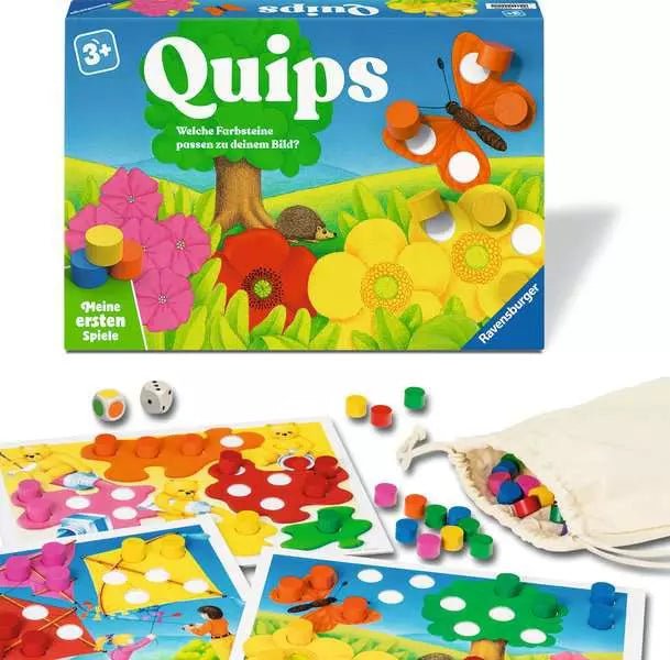 Quips lässt sich flexibel an den Entwicklungsstand anpassen. Zu Beginn steht das freie Zuordnen der Farben im Vordergrund. Später können Farbwürfel und Punktewürfel hinzukommen, um erste einfache Spielregeln kennenzulernen. Das Greifen und Platzieren der Holzsteine fördert gezielt die Feinmotorik, während das Abzählen der fehlenden Elemente Konzentration und logisches Denken unterstützt. Alle Spielmaterialien sind übersichtlich gestaltet und für wiederholtes Spielen geeignet.