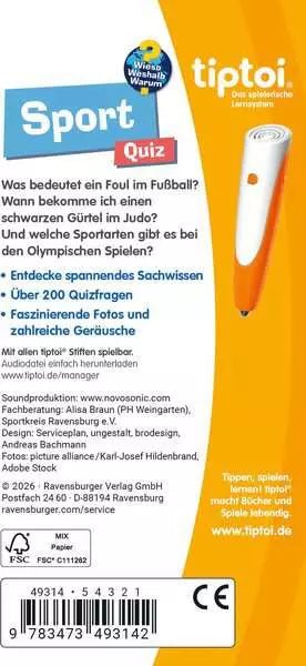 Dieses Quizbuch richtet sich an Kinder von 4 bis 7 Jahren und behandelt eine breite Auswahl an Sportarten. Themen wie Fußball, Judo, Basketball oder olympische Disziplinen werden in kurzen, verständlichen Quizfragen aufgegriffen. Mit dem tiptoi Stift hören die Kinder Fragen, wählen Antworten aus und erhalten direkte Rückmeldungen. Fotos und typische Geräusche aus der Sportwelt ergänzen die Inhalte.