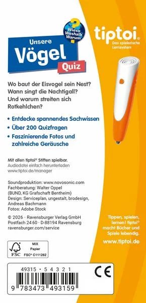 Dieses Quizbuch richtet sich an Kinder von 4 bis 7 Jahren und widmet sich der heimischen Vogelwelt. Amsel, Buchfink, Star oder Nachtigall stehen im Mittelpunkt. Mit dem tiptoi Stift hören die Kinder Fragen, wählen Antworten aus und erhalten direkte Rückmeldungen. Ergänzt werden die Quizfragen durch realistische Fotos und originale Vogelstimmen, die das Wiedererkennen der Arten unterstützen.