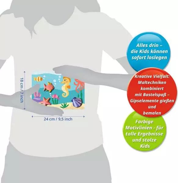 Das Set enthält 15 fertig gemischte Acrylfarben sowie Gips zum Anrühren und eine verständliche Anleitung. Beim Malen und Basteln werden Geduld, Genauigkeit und Feinmotorik gezielt gefördert. Das fertige Kunstwerk sorgt für Stolz, Freude und Motivation für weitere kreative Projekte.