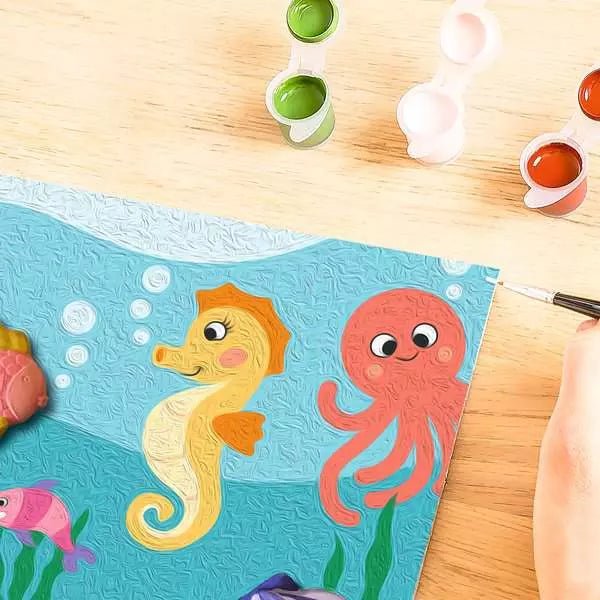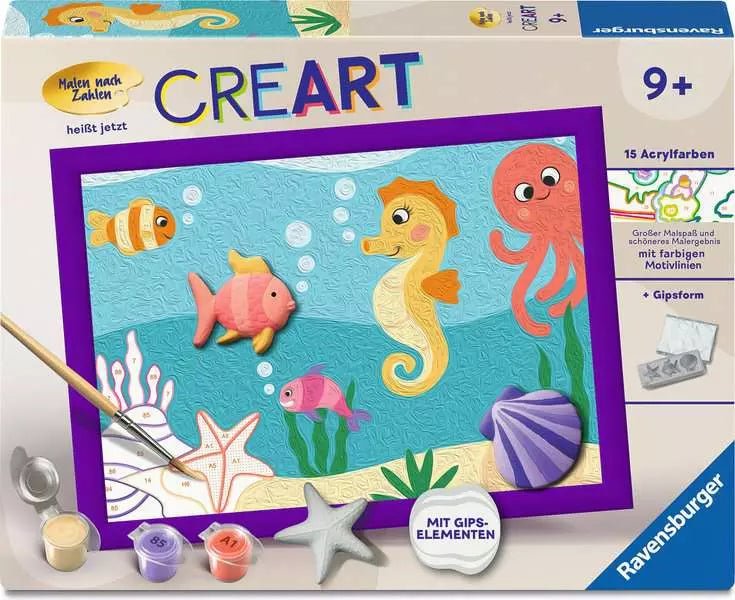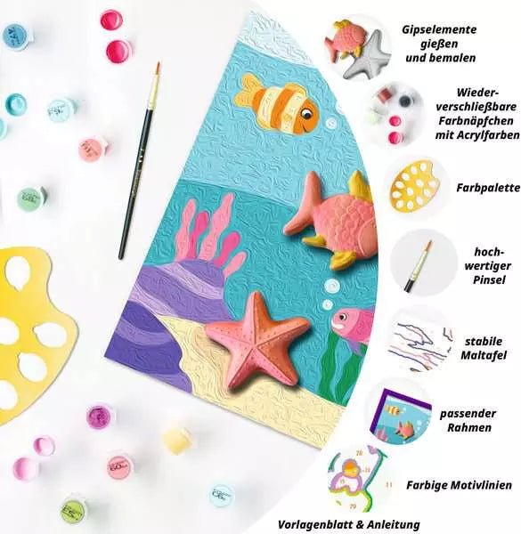 Mit CreArt Malen nach Zahlen mit Gips gießen – Meeresfreunde entdecken Kinder die Unterwasserwelt auf kreative Weise. Dank der farbigen Motivlinien gelingt das Ausmalen Schritt für Schritt besonders einfach. Zusätzlich werden passende Gips-Elemente selbst gegossen, bemalt und auf das Bild geklebt – so entsteht ein spannender 3D-Effekt mit maritimem Flair.