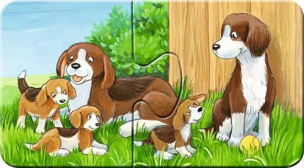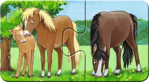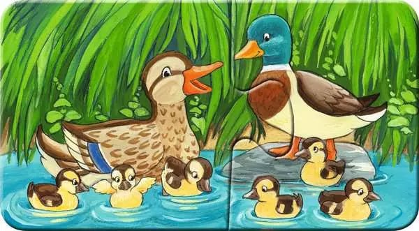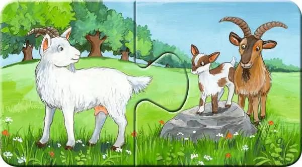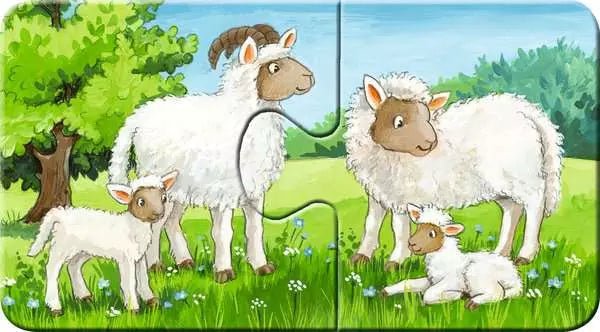 - Das Puzzle besteht aus 9 zweiteiligen Motiven mit Tierfamilien vom Bauernhof – Kuh und Kalb, Huhn und Küken oder Schaf und Lamm.