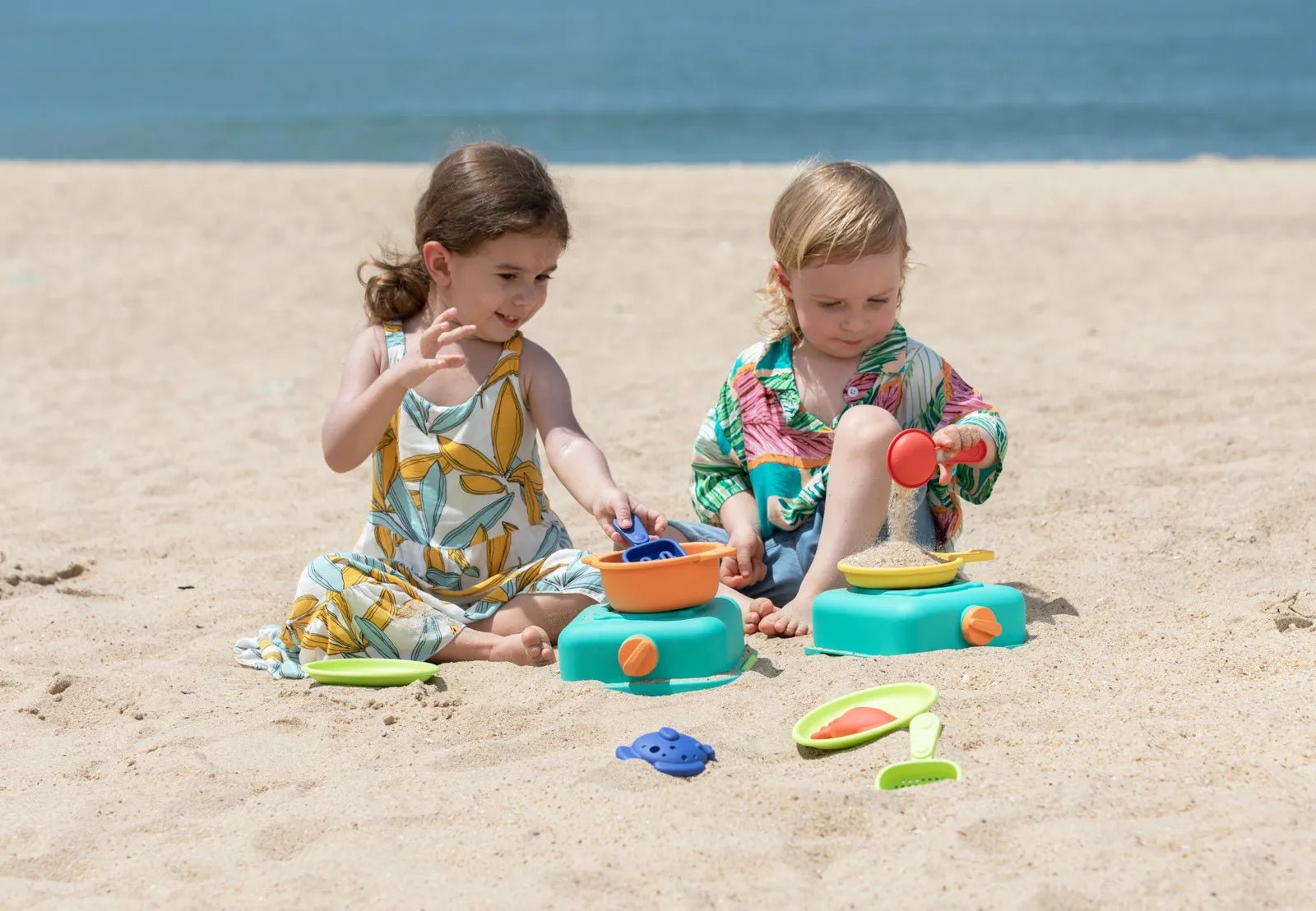 Das Sandspielzeug von Hape kombiniert das klassische Sandbuddeln mit Rollenspiel-Fantasie: Wer in der Sandküche kocht, entwickelt nicht nur Feingefühl für die Förmchen, sondern auch sprachliche und soziale Fähigkeiten durch das gemeinsame Spielen mit anderen Kindern. Das Set passt problemlos in eine Strandtasche und ist nach kurzer Abspülung sofort wieder einsatzbereit.