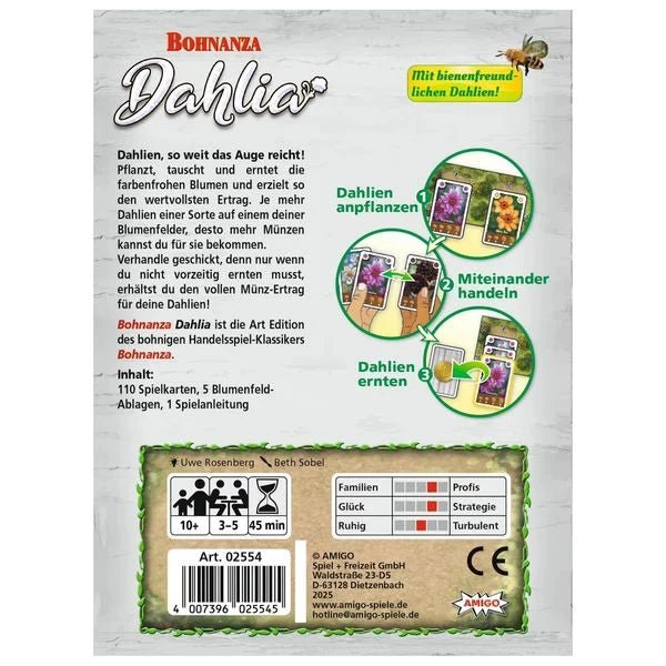 Mit Bohnanza – Dahlia bringt AMIGO eine kunstvoll gestaltete Edition des erfolgreichen Handelsspiels von Uwe Rosenberg auf den Tisch. Statt Bohnen dreht sich hier alles um farbenfrohe Dahlien, die geschickt gepflanzt, getauscht und geerntet werden müssen.