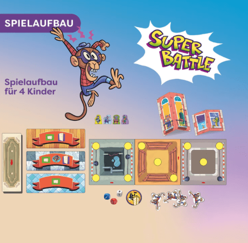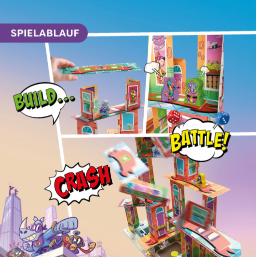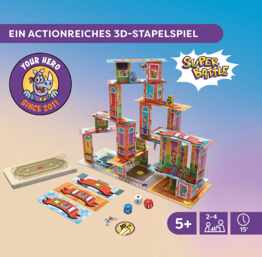Rhino Hero – Super Battle ab 5 Jahren bringt actionreiche Hochspannung auf den Spieltisch. In diesem 3D Stapelspiel für Kinder und Familien entstehen wackelige Wolkenkratzer, auf denen sich Rhino Hero und seine Superhelden-Freunde spektakuläre Duelle liefern. Runde für Runde werden Zwischenböden und Wände platziert, während Spider Monkeys für zusätzliche Herausforderungen sorgen. Mit ruhiger Hand, Fingerspitzengefühl und etwas Würfelglück kämpfen die Spieler um die höchste Position auf dem Turm. Das Rhino Hero Super Battle Spiel ab 5 Jahren verbindet Geschicklichkeit mit taktischen Elementen und kurzen, spannenden Spielrunden. Ideal für Familien, die rasante Action und wackelige Bauabenteuer lieben.