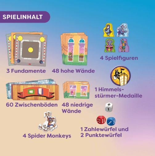 • Inhalt: 3 doppelseitige Spielpläne, 60 Zwischenböden, 48 hohe Wände, 48 niedrige Wände, 4 Spielfiguren, 4 Spider Monkeys, 3 Würfel, 1 Medaille