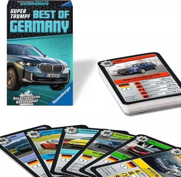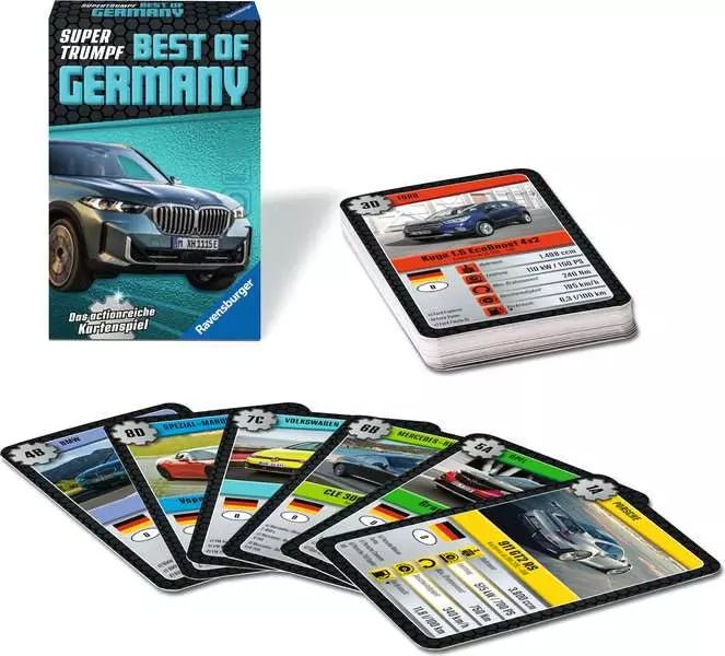 Das Kartenspiel Supertrumpf Best of Germany ab 7 Jahren von Ravensburger ist ein klassisches Trumpf- und Sammelkartenspiel rund um Fahrzeuge deutscher Automarken. Gespielt wird mit illustrierten Karten, auf denen verschiedene Automodelle mit technischen Daten dargestellt sind. Die Spieler vergleichen jeweils ein ausgewähltes Leistungsmerkmal wie Motorleistung oder Verbrauch, um die Karten der Mitspieler zu übertrumpfen.