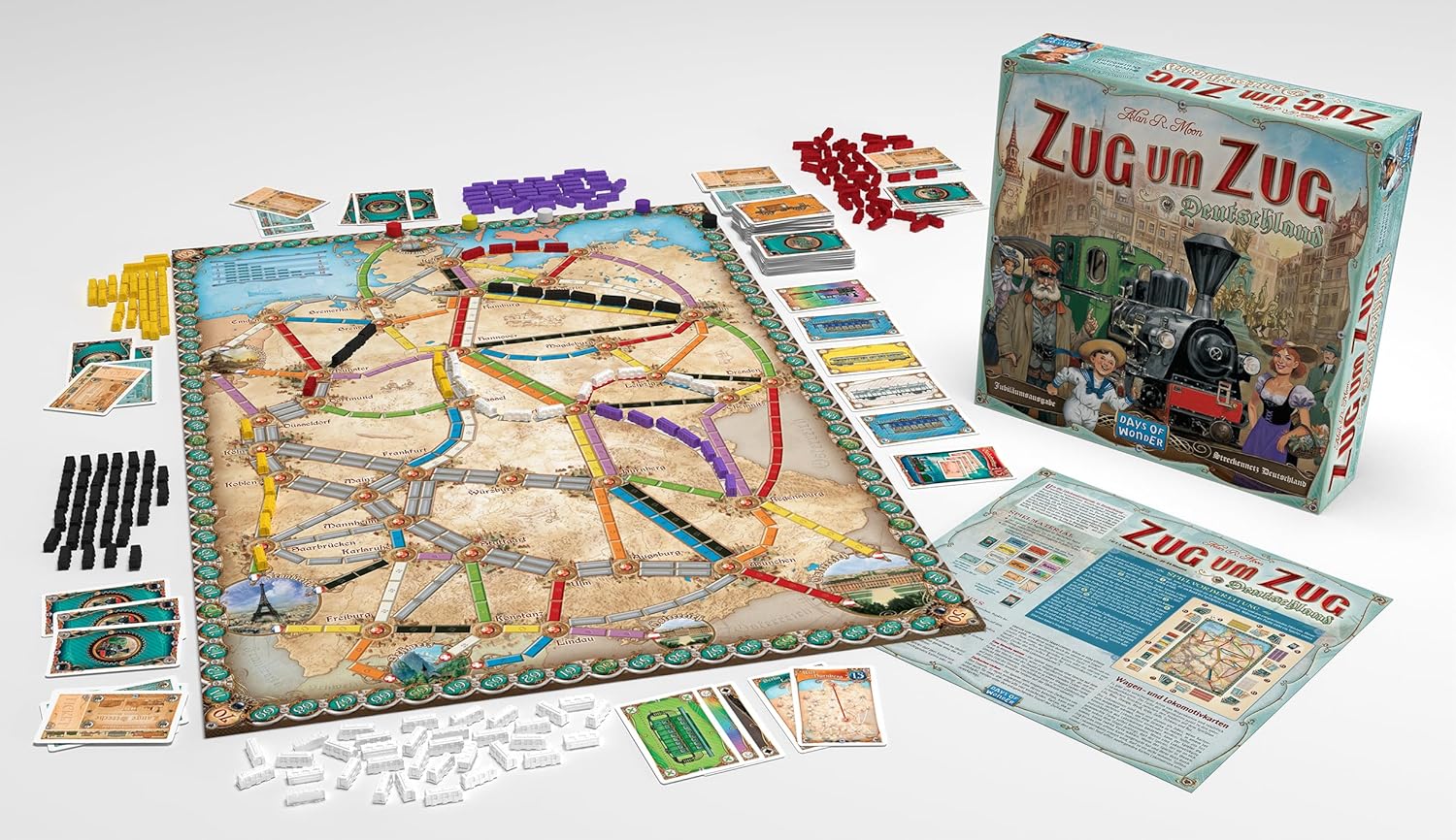 Das Zug um Zug – Deutschland (Auflage 2023) von Days of Wonder führt euch auf ein spannendes Abenteuer durch das Bahnnetz der Jahrhundertwende. Errichtet Strecken von Nürnberg nach München, weiter nach Berlin, und sammelt Punkte für erfüllte Zielkarten. Diese Edition enthält bereits die Erweiterung Deutschland 1902 mit zusätzlichen Zielkarten und Passagieren, die das klassische Spielgefühl um taktische Tiefe erweitern. Ein ideales Familienspiel für strategische Köpfe, Einsteiger und Bahnliebhaber.