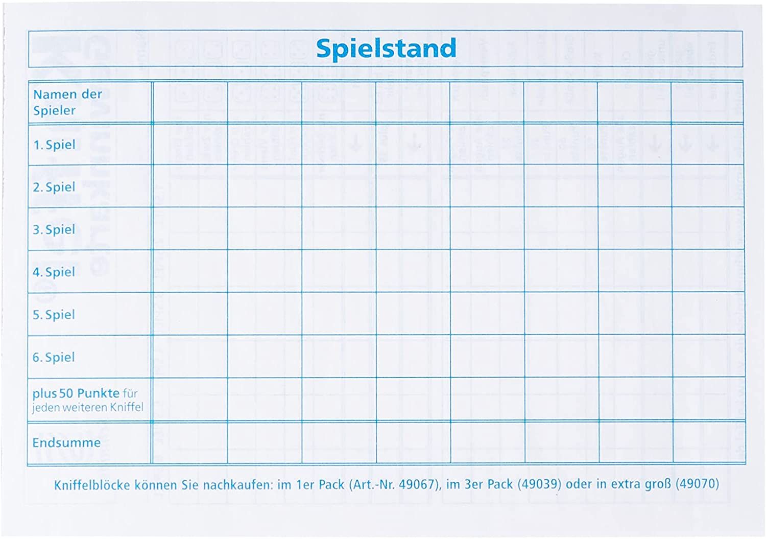 Als original Kniffel Zubehör ergänzt der Zusatzblock jedes Kniffel-Spiel optimal und eignet sich ideal für Vielspieler, Spielclubs oder als Ersatzblock. Ob spontane Runde oder ausgedehntes Turnier: Der Kniffel Zusatzblock im Großformat ab 8 Jahren sorgt für Struktur, Übersicht und ungetrübten Spielspaß. Herausgegeben von der Schmidt Spiele GmbH steht der Block für bewährte Qualität und klassisches Spielvergnügen.