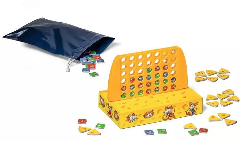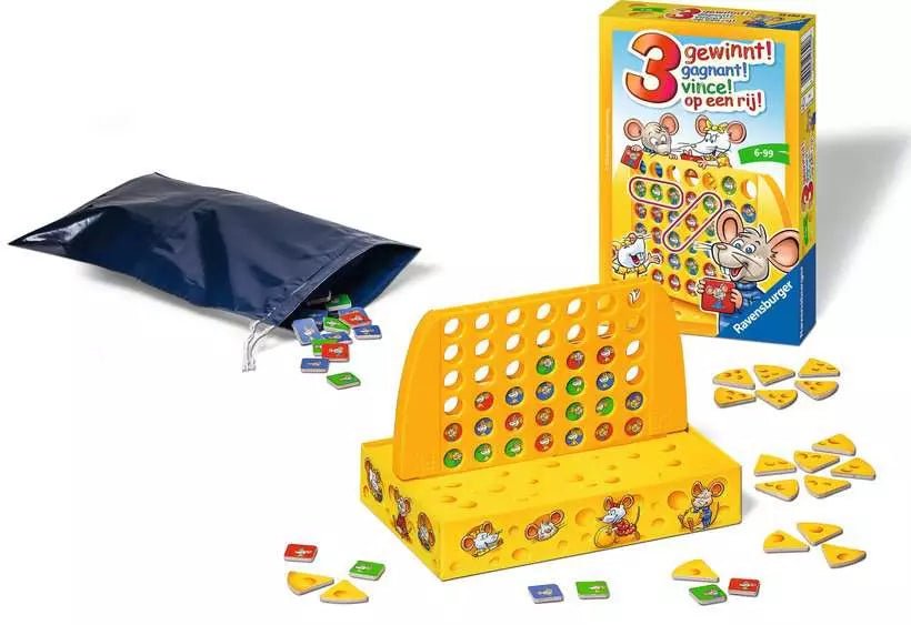 Bei diesem kompakten Reisespiel platzieren die Spieler nacheinander ihre Mäuse im Käsegitter. Gelingt es, drei Mäuse derselben Art in eine Reihe zu bringen, erhält man ein Käsestück. Das Spiel kombiniert einfache Regeln mit taktischen Entscheidungen und eignet sich für kurze, abwechslungsreiche Spielrunden.
