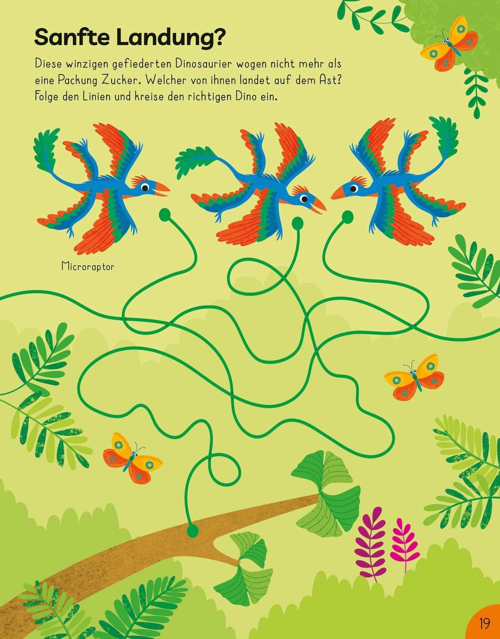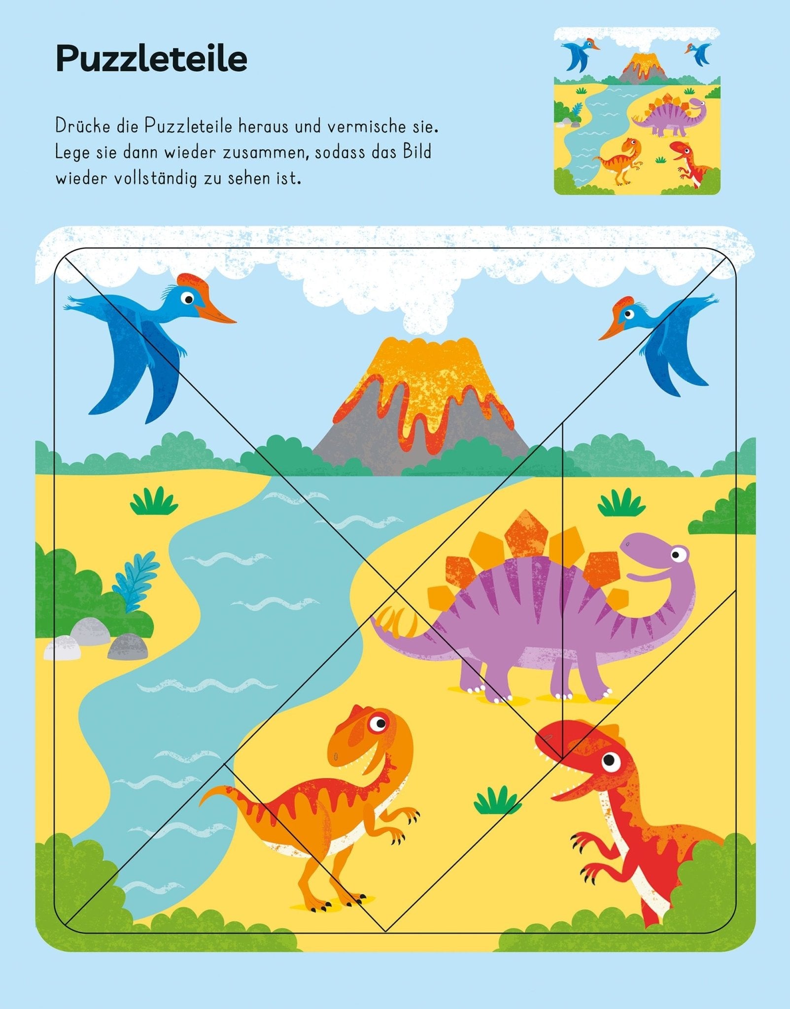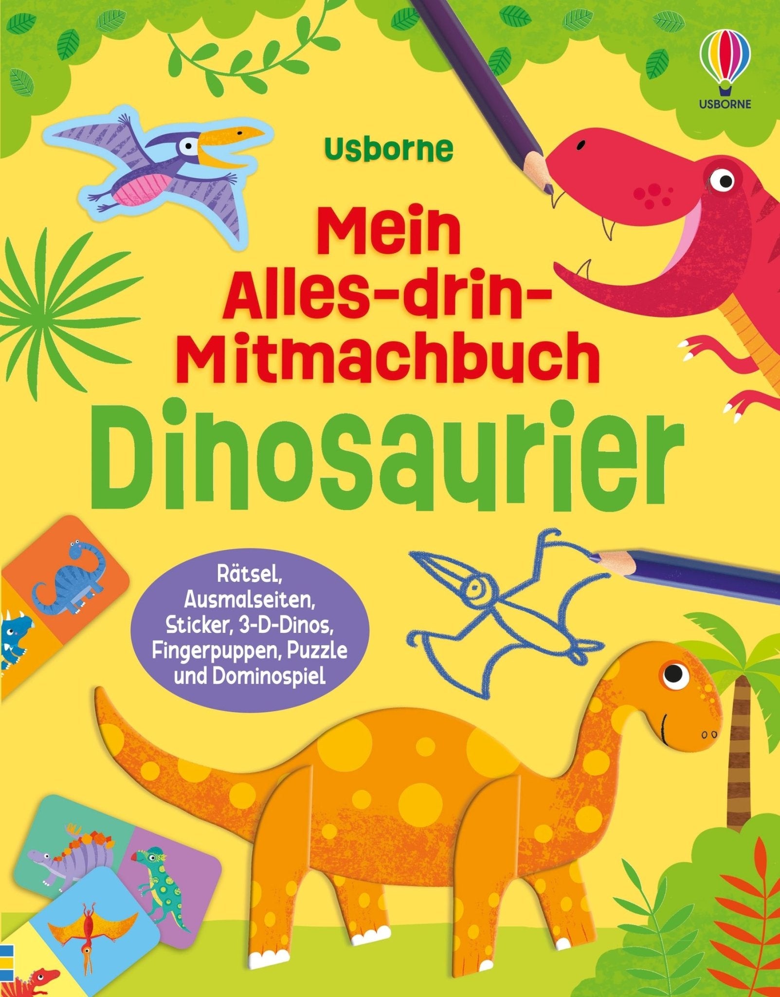 Das Dinosaurier Mitmachbuch von Usborne macht aus einer einzigen Buchseite manchmal gleich drei Aktivitäten: Der Microraptor im Labyrinth will gefunden werden, das Puzzle mit dem Vulkan wartet aufs Zusammensetzen, und das 3-D-Modell des Brachiosaurus liegt schon perforiert bereit. Kirsteen Robsons Text hält dabei die richtige Balance zwischen Spielspaß und echten Dinosaurierfakten – mit Lautschrift für jeden Artnamen bleibt auch die Aussprache kein Rätsel. Christine Sheldons Illustrationen verbinden wissenschaftliche Genauigkeit mit einer fröhlichen, kindgerechten Farbwelt. Das Beschäftigungsbuch Dinosaurier lässt sich kapitelweise durcharbeiten oder nach Belieben aufschlagen – jede Seite funktioniert für sich.
