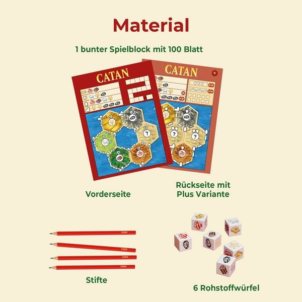 Das Catan Würfelspiel Familie von Kosmos überträgt das bewährte Inselaufbau-Prinzip in ein schnelles Würfelformat, das ohne Spielfeld und Karten auskommt. Statt Karten zu ziehen entscheiden geprägte Würfelsymbole darüber, welche Rohstoffe gewonnen und welche Bauwerke errichtet werden können. Als Würfelspiel für Familien ab 7 Jahrenfunktioniert das Spiel zu zweit ebenso wie in der Viererrunde und ist in 30 Minuten gespielt. Die zwei enthaltenen Spielvarianten verlängern die Lebensdauer des Sets und bieten auch eingefleischten Catan-Fans neue taktische Herausforderungen.