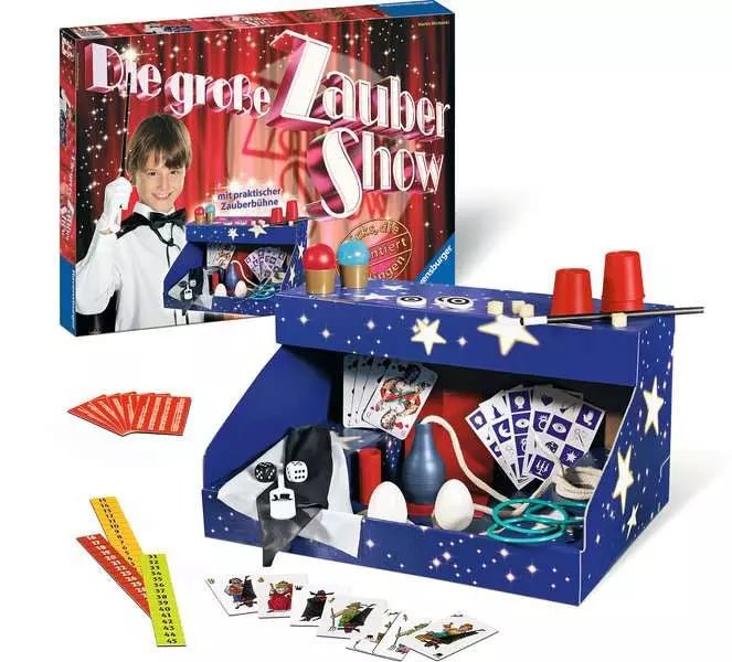 Der Zauberkasten Die große Zaubershow richtet sich an Kinder ab 8 Jahren und vermittelt Schritt für Schritt grundlegende Zaubertricks. Mithilfe der beiliegenden Anleitung lernen Kinder zunächst einfache Einstiegstricks und erweitern ihr Können anschließend um Karten-, Seil- und Tuchtricks. Weitere Tricks werden mit Ringen, Würfeln, Bällen, Zauberfolie, Münzen und Eiern durchgeführt.