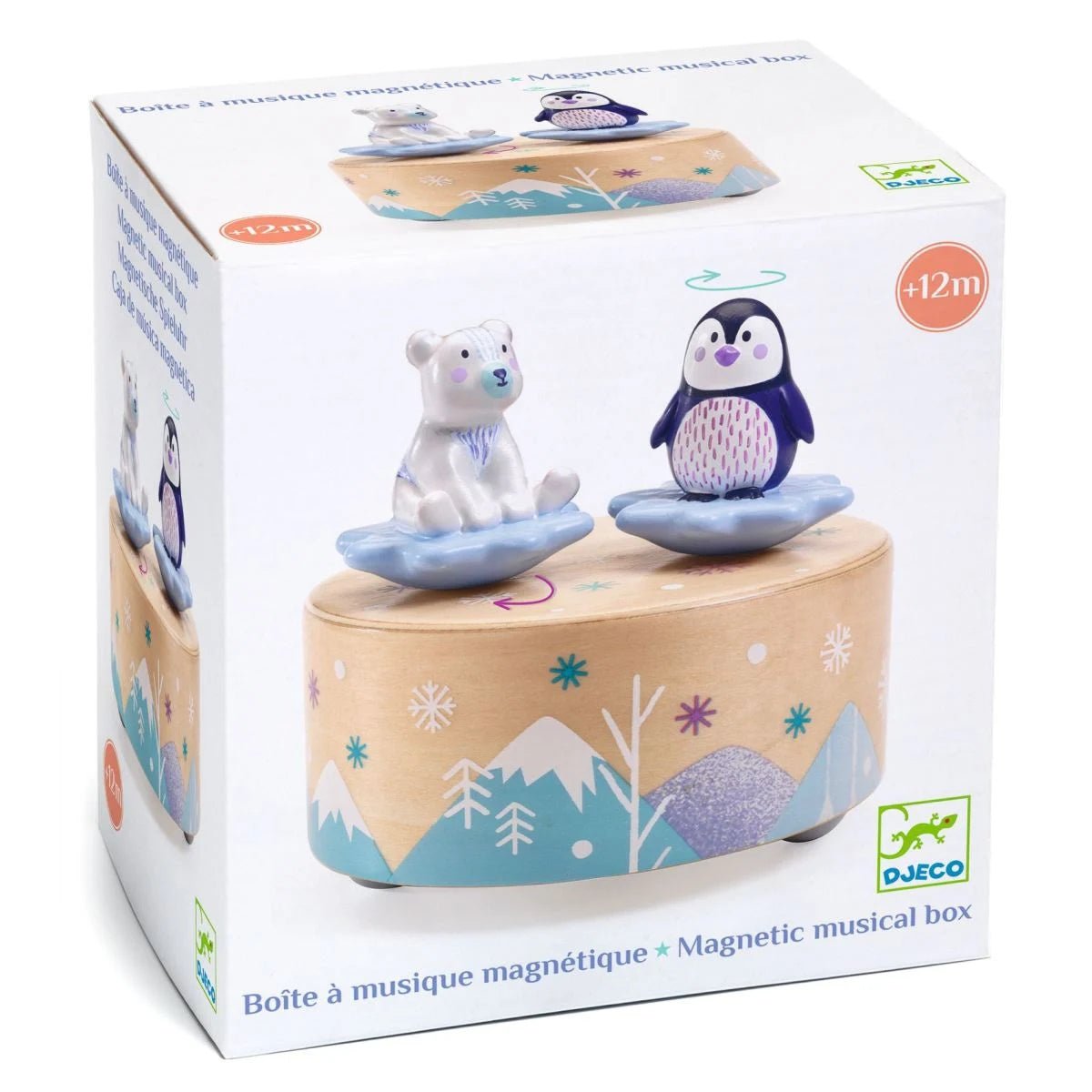 Die Djeco Musikuhr Eisbär & Pinguin verzaubert mit einer Kombination aus Musik, Bewegung und Design. Nach dem Aufziehen tanzen die magnetischen Figuren sanft im Kreis – begleitet von der „Kindersinfonie“ Mozarts, die eine ruhige, wohltuende Atmosphäre schafft.
