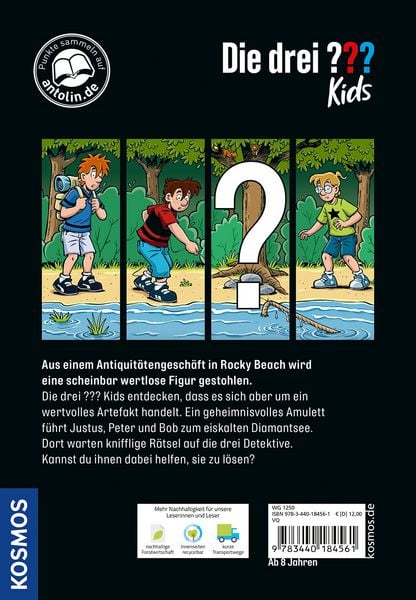 Das Die drei ??? Kids Gefährliche Fährten Buch verbindet eine Detektivgeschichte mit einem interaktiven Leseerlebnis. Nach einem Einbruch in ein Antiquitätengeschäft beginnen Justus, Peter und Bob ihre Ermittlungen. Ein geheimnisvolles Amulett führt sie zu neuen Spuren und schließlich zum Diamantsee. Dort treffen sie auf eine rätselhafte Jägerin und Hinweise auf weitere verborgene Schätze. Das Abenteuer eignet sich besonders für Leser, die interaktive Detektivgeschichten für Kinder ab 8 Jahren und Mitmach-Krimis mit Entscheidungswegen mögen.