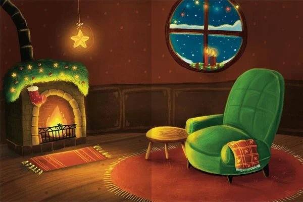 Liebevoll illustrierte Szenen rund um Schnee, Schlitten und Kaminfeuer