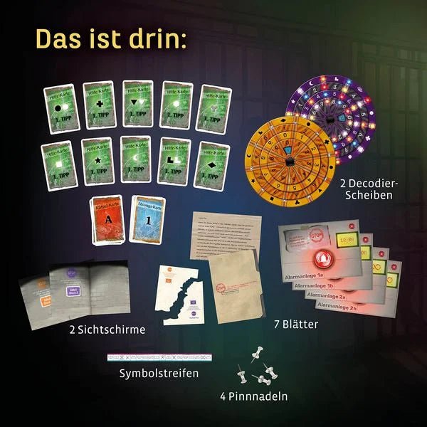 Die Besonderheit dieses Szenarios liegt in der Team-Challenge: Zwei Gruppen von jeweils ein bis zwei Personen spielen parallel und beeinflussen sich gegenseitig. Karten, Orts-Blätter und die Decodier-Scheibe führen Schritt für Schritt durch das Abenteuer.