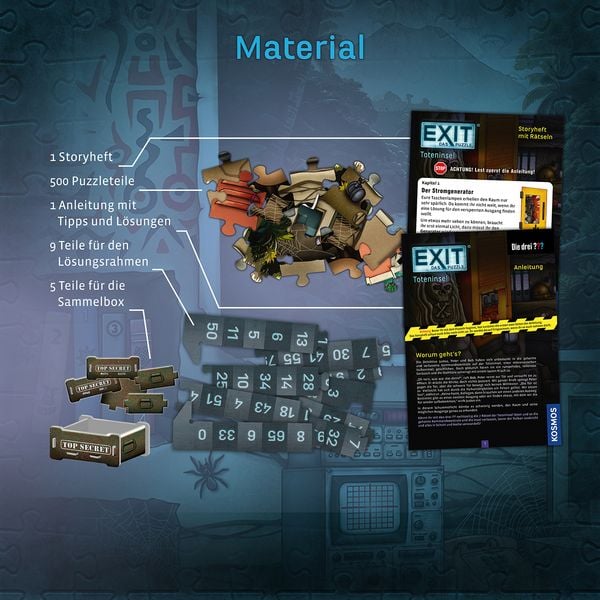 Das Exit Puzzle Die drei Fragezeichen von Kosmos verbindet zwei eigenständige Erlebnisse – das schrittweise Zusammensetzen eines detailreichen 500-Teile-Motivs und das Lösen von sieben Rätseln, die im Bild selbst verborgen sind. Die Geschichte um Justus, Peter und Bob wird parallel zum Puzzeln gelesen und steigert die Spannung mit jedem gelegten Teil. Als Escape-Room-Puzzle ab 10 Jahren funktioniert das Set alleine oder im Team und bietet durch die individuelle Teileform einen zusätzlichen Puzzlereiz. Das enthaltene Hinweisheft ermöglicht es, bei schwierigen Rätseln gezielt Hilfe zu holen, ohne die Lösung vollständig preiszugeben.