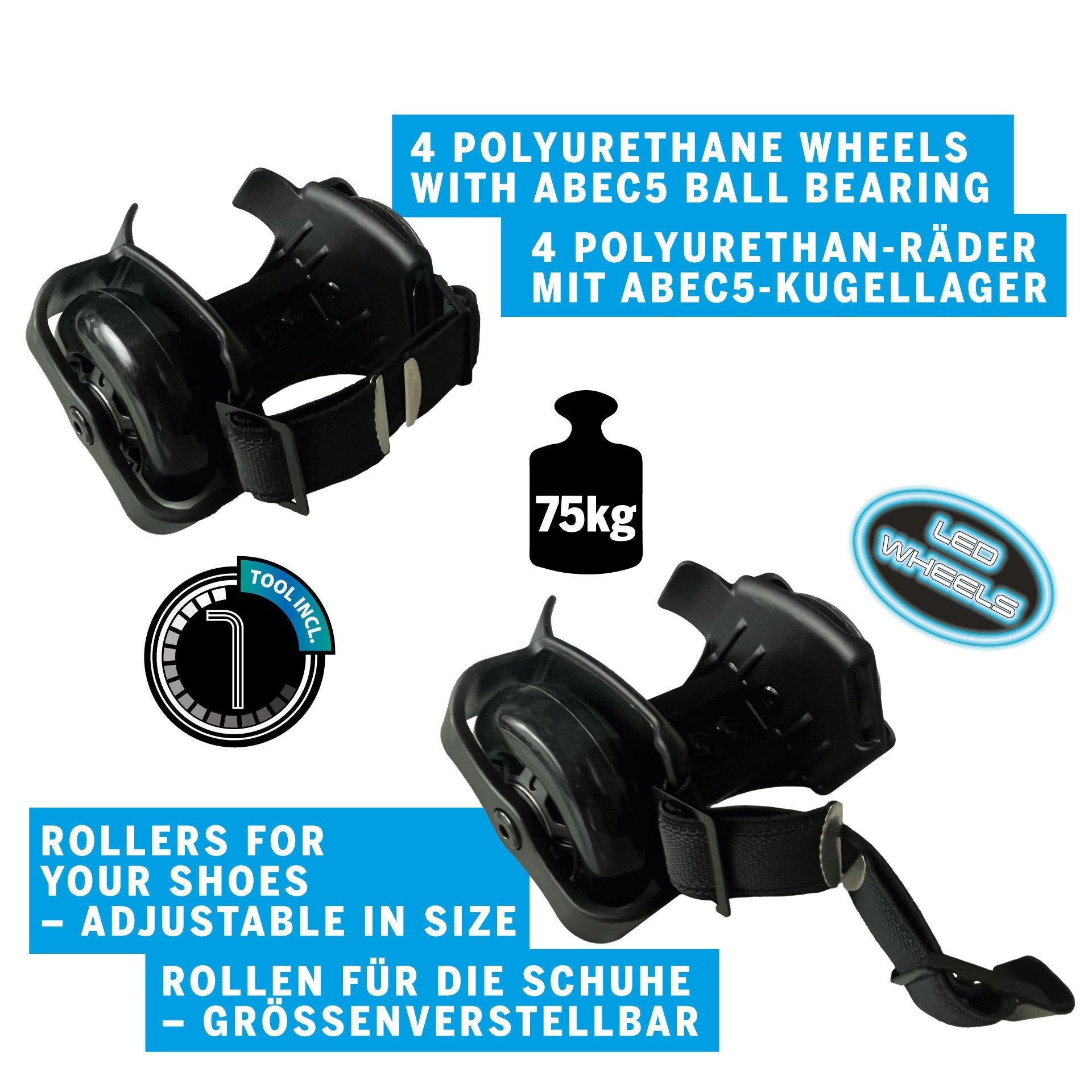 Die Flashy Rollers von Schildkröt erweitern das Gehen um eine gleitende Bewegung. Die Rollen werden an der Ferse des Schuhs befestigt und ermöglichen kurze Rollphasen zwischen Schritten. ABEC5 Kugellager unterstützen gleichmäßige Bewegung auf glatten Untergründen. Die eingebauten LED-Lichter aktivieren sich durch Bewegung der Räder. Die Konstruktion trägt bis zu 75 Kilogramm und lässt sich mit dem beiliegenden Werkzeug anpassen.