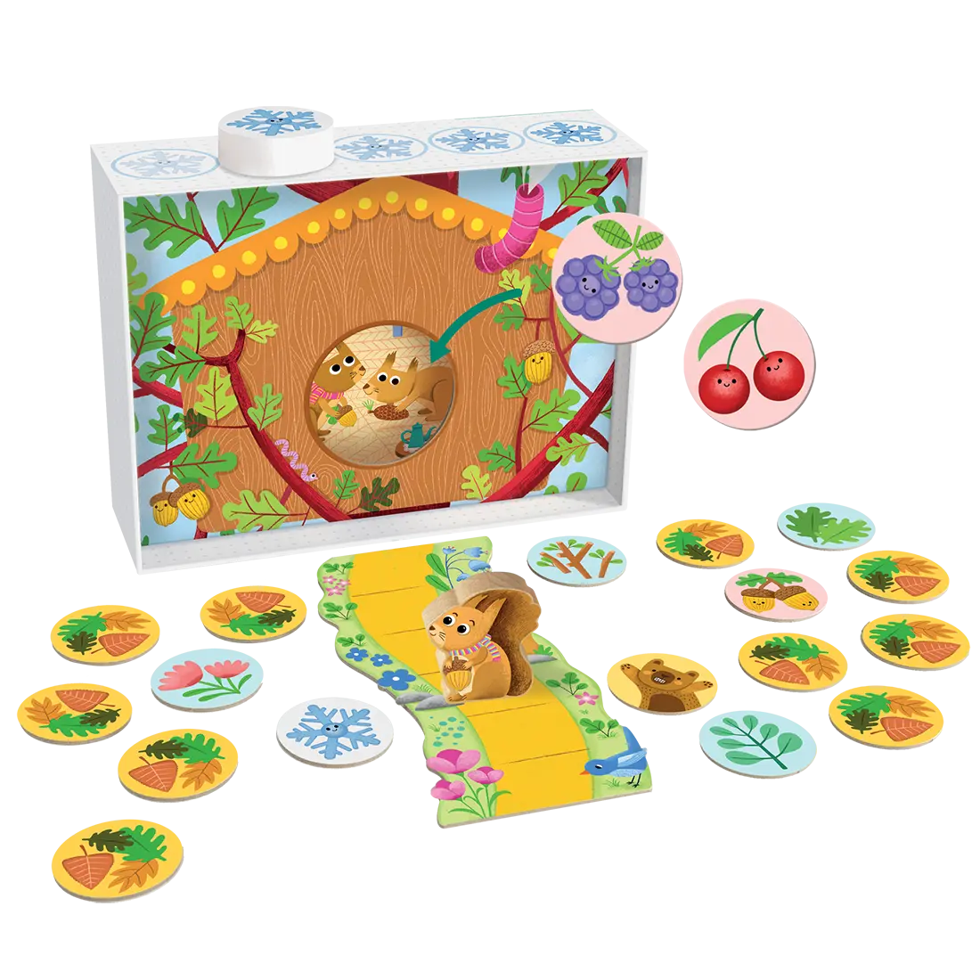 Das Goula Baumhaus Lernspiel ab 3 Jahren ist ein kooperatives Familienspiel, bei dem Kinder gemeinsam einem kleinen Eichhörnchen helfen, Nahrung zu sammeln und rechtzeitig im Baumhaus zu verstauen, bevor der Winter eintrifft. Dabei steht nicht das Gewinnen gegeneinander, sondern das gemeinsame Erreichen eines Ziels im Mittelpunkt.