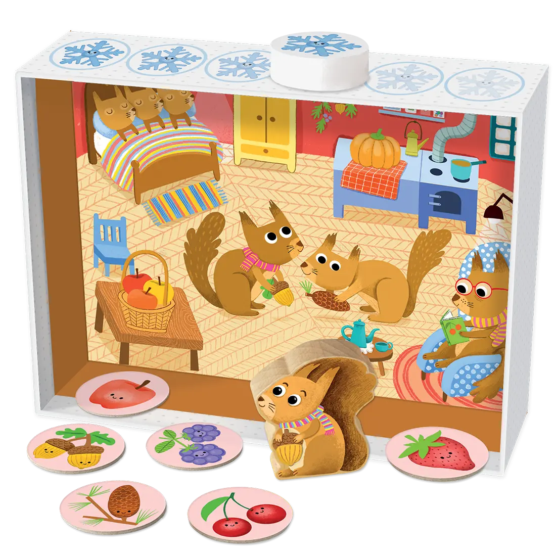 Inhalt: 1 Eichhörnchen-Holzfigur, Spielbox, 24 Pappmarken.