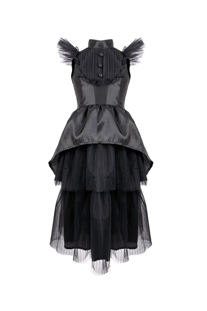 Das Hexenkleid Gothic Mischief – Witch Dress in Größe US 7–8 Jahre von Great Pretenders verbindet dunkle Eleganz mit kindgerechtem Tragekomfort. Das Kleid ist vollständig in Schwarz gehalten und besticht durch seine gothisch inspirierte Gestaltung, die dennoch verspielt und altersgerecht bleibt. Der hochgeschlossene Kragen mit drei dekorativen Knöpfen verleiht dem Kleid eine klassische, leicht mystische Ausstrahlung.