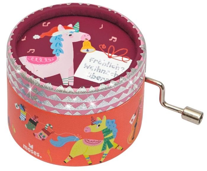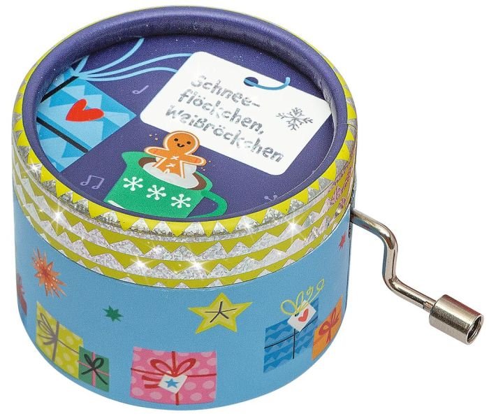 Ein kurzes Drehen an der Handkurbel genügt – und schon erklingen vertraute Weihnachtslieder wie „Fröhliche Weihnacht überall“ oder „Schneeflöckchen, Weißröckchen“. Das Gehäuse ist liebevoll mit winterlichen Motiven dekoriert und mit holografischem Effekt veredelt, wodurch die Spieluhr nicht nur klangvoll, sondern auch optisch besonders wirkt. In zwei Varianten erhältlich, ist sie eine nostalgische Kleinigkeit für Kinder wie Erwachsene und eine bezaubernde Idee für die Adventszeit.