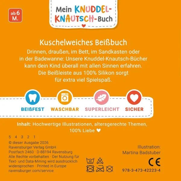 Ob im Bett, im Sandkasten, in der Badewanne oder unterwegs: Das robuste Stoffbuch für Babys ist vielseitig einsetzbar und dank Waschbarkeit bei 60 °C besonders hygienisch und langlebig. Die praktische Schlaufe ermöglicht eine schnelle Befestigung am Hochstuhl, Laufstall oder Kinderwagen. Gestaltet von Martina Badstuber, ist dieses Knuddel-Knautsch-Buch ein hochwertiges Babyspielzeug, das spielerisch Motorik und Sinneswahrnehmung fördert.
