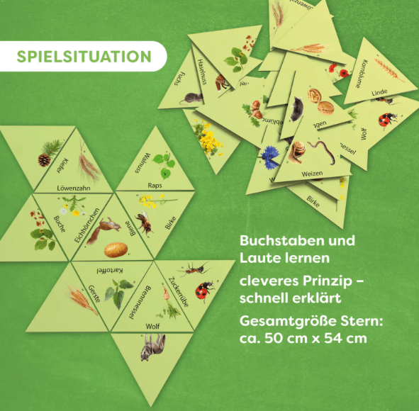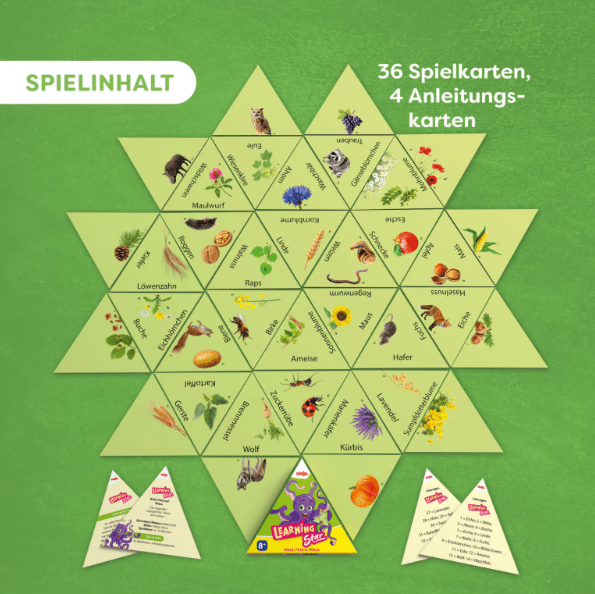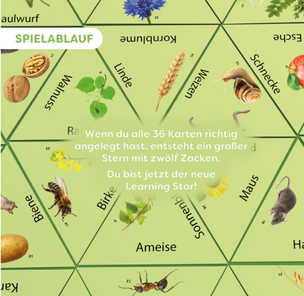 Das Natur Lernspiel ab 8 Jahren fordert Kinder dazu auf, passende Wort- und Bildkarten miteinander zu kombinieren. Jede richtige Verbindung erweitert den Stern aus Karten und zeigt, ob die Zuordnung stimmt. Die klare Struktur ermöglicht einen schnellen Einstieg ohne lange Vorbereitung. Kinder beschäftigen sich dabei mit Naturmotiven und Begriffen aus der Umwelt. Besonders geeignet ist das Spiel als Natur Lernspiel für Grundschulkinder.