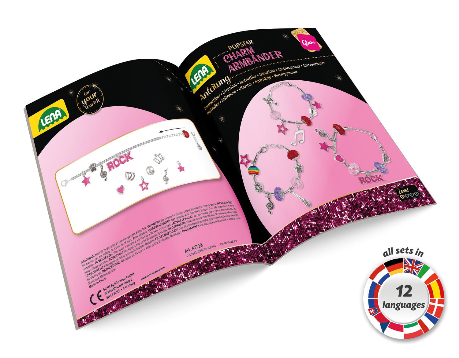 Das LENA Charm Armbänder Popstar Set enthält drei stylische Metallarmbänder, die mit bunten Perlen, schicken Charms und glänzenden Anhängern individuell gestaltet werden können. Mit der beiliegenden ausführlichen, farbig bebilderten Anleitung gelingt das kreative Schmuckbasteln Schritt für Schritt. Dieses DIY Schmuck Bastelset für Kinder ab 8 Jahren bietet abwechslungsreichen Bastelspaß und fördert die kreative Gestaltung von einzigartigen Accessoires. Verpackt ist das Set in einer handlichen Faltschachtel mit Produktinformationen, die für eine sichere Aufbewahrung sorgt. Das Bastelkit ist geschlechtsneutral, lizenzfrei und aus China importiert.