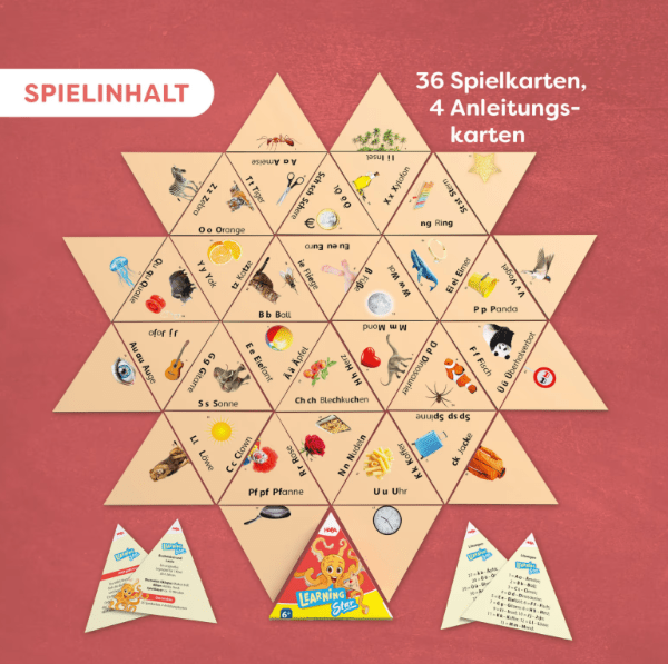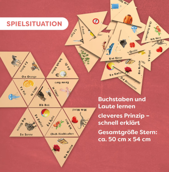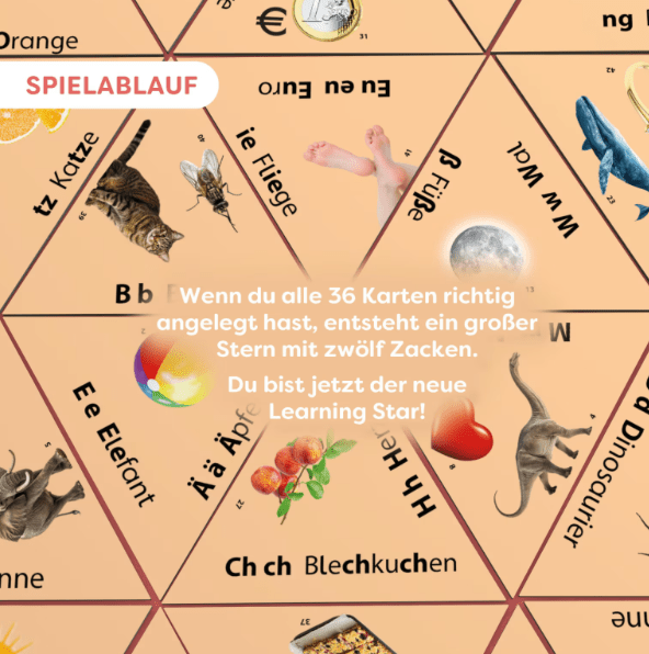 Das Lernspiel Wort Bild ab 6 Jahren verbindet Wortkarten mit passenden Motiven und unterstützt Kinder beim Entdecken von Lauten und Buchstaben. Nach und nach entsteht aus den Karten ein großer Stern, sobald die richtigen Wort-Bild-Paare gefunden werden. Die einfache Spielstruktur erlaubt einen schnellen Einstieg ohne lange Vorbereitung. Durch die kurze Spieldauer eignet sich das Spiel auch für kleine Lernpausen zu Hause oder unterwegs. Besonders geeignet ist das Spiel für Kinder, die Lesen üben oder ein Wort-Bild-Lernspiel für die Grundschule suchen.
