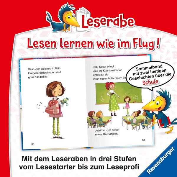 Leserabe Schulabenteuer zum Lesenlernen vereint zwei humorvolle Geschichten, die Kindern den Einstieg ins Lesen besonders leicht machen. In einer Geschichte sorgt ein frecher Abc-Käfer dafür, dass Pauls Hausaufgaben verschwinden, in der anderen bringt Jule mit ihren versteckten Meerschweinchen ordentlich Chaos in den Schulalltag. Die kindnahen Erzählungen motivieren zum Weiterlesen und sorgen für schnelle Erfolgserlebnisse.
