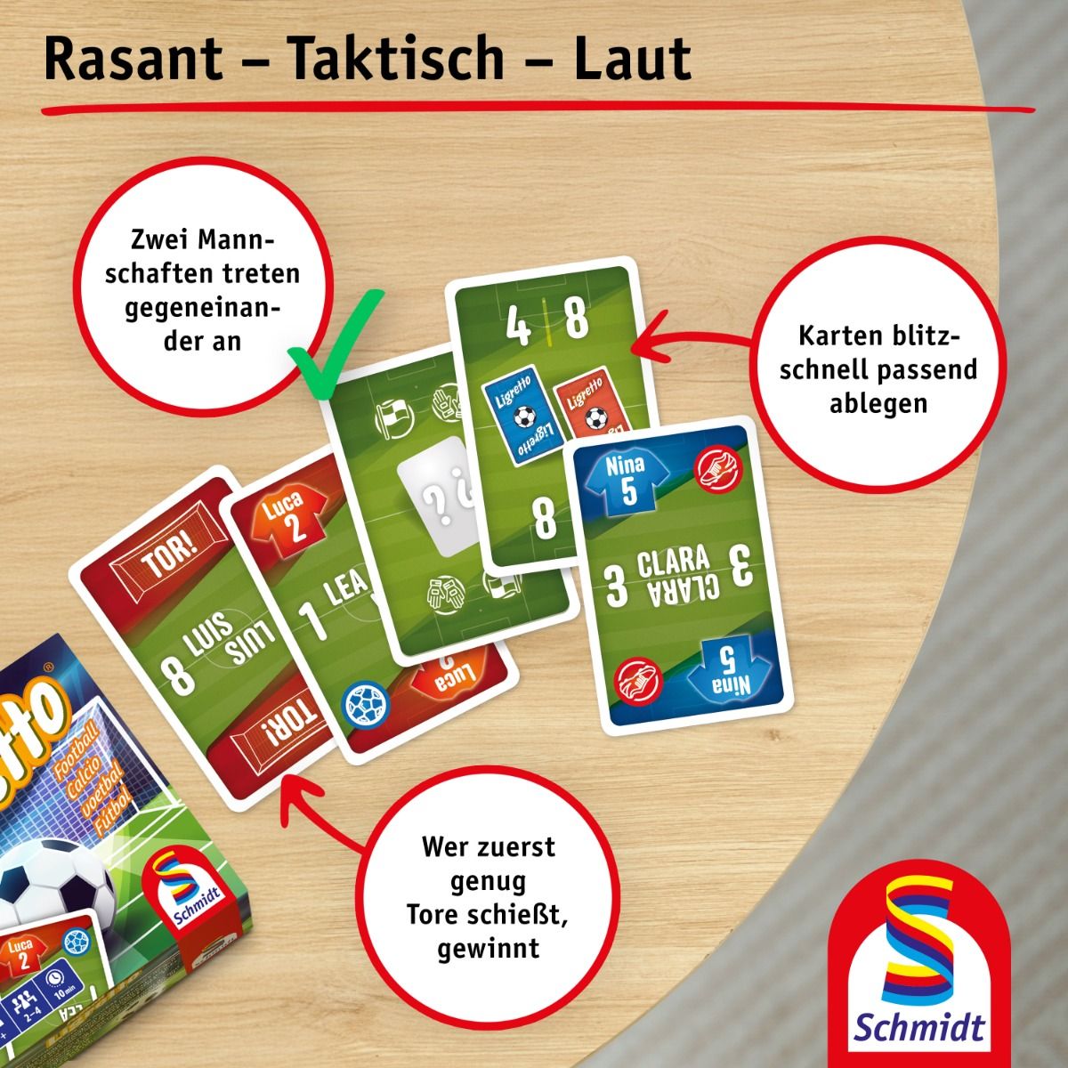 Ligretto Fußball bringt Tempo und Teamgeist an den Spieltisch. In diesem schnellen Kartenspiel ab 7 Jahren treten zwei Mannschaften gegeneinander an und kämpfen um die meisten Tore. Alle Spieler sind gleichzeitig aktiv – hier zählen Reaktionsvermögen, Übersicht und Schnelligkeit.