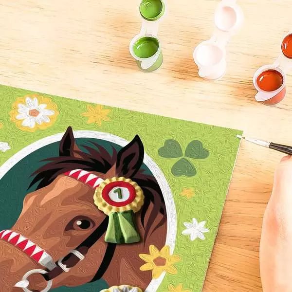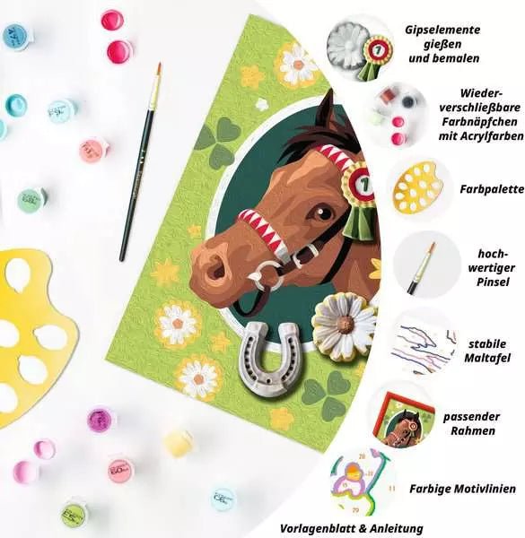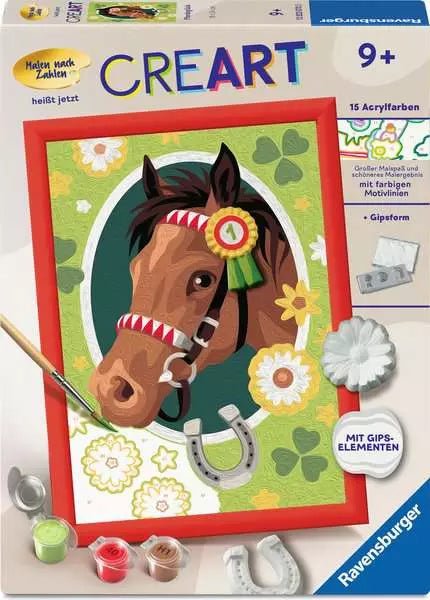 Mit CreArt Malen nach Zahlen mit Gips gießen – Pferdeglück erleben Kinder kreativen Bastelspaß mit einem liebevoll gestalteten Pferdemotiv. Dank der farbigen Linien gelingt das Ausmalen Schritt für Schritt ganz einfach. Zusätzlich werden passende Gips-Elemente selbst gegossen, bemalt und anschließend auf das Bild geklebt – so entsteht ein besonderer plastischer Effekt.
