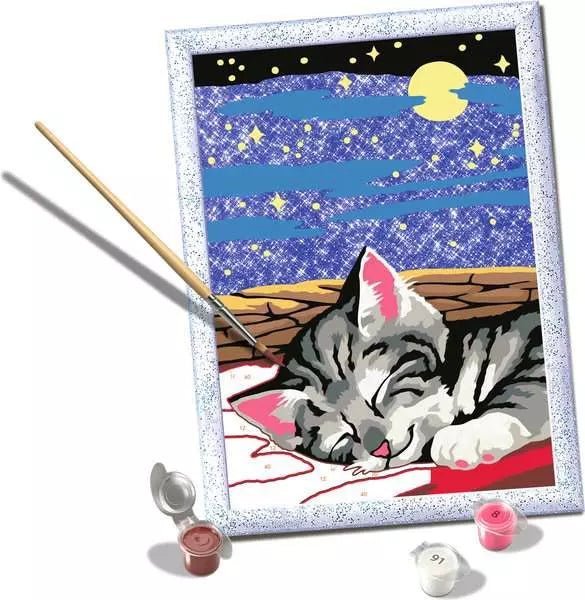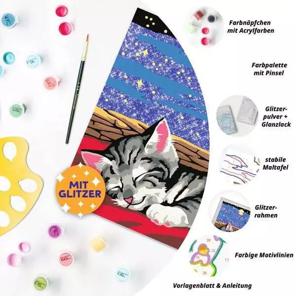 Mit CreArt Malen nach Zahlen – Katzenträume tauchen Kinder in eine fantasievolle Katzenwelt ein. Dank der farbigen Motivlinien erkennen sie die passenden Farben besonders leicht und können das Motiv Schritt für Schritt sauber ausmalen. Funkelnde Glitzer-Details verleihen dem Bild einen besonderen Zauber und machen das Ergebnis zu einem echten Hingucker.