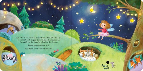 Das interaktive Gutenachtbuch bietet magischen Pustespaß, der kleine Augen funkeln lässt. Durch das Pusten auf den im Buch integrierten Sensor beginnen auf jeder Seite 4 LED-Lichter zu leuchten. Spielerisch wird so die Mundmotorik und Konzentration trainiert. Ein zauberhafter Einschlafbegleiter mit atmosphärischen Illustrationen für Kleinkinder ab 18 Monaten.