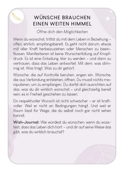 Mit dem Kartenset Wünsche manifestieren aus der Reihe Omm for you entdecken Kinder und Erwachsene spielerisch die Kraft der positiven Gedanken. Die 50 Karten erklären Schritt für Schritt, wie sich Herzenswünsche durch Manifestation im Alltag, im Job und in der Liebe verwirklichen lassen. Dabei lernen die Nutzerinnen und Nutzer, einen Wunsch klar zu formulieren, innerlich loszulassen und darauf zu vertrauen, dass neue Möglichkeiten entstehen.