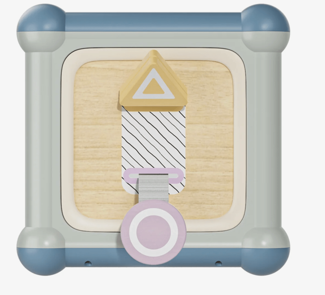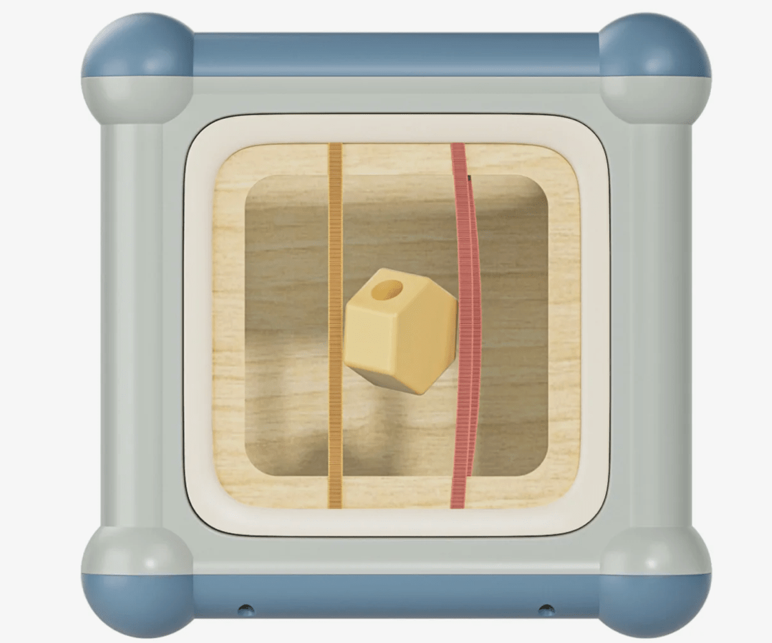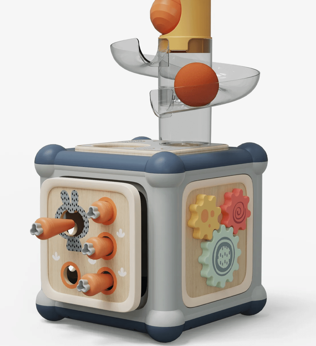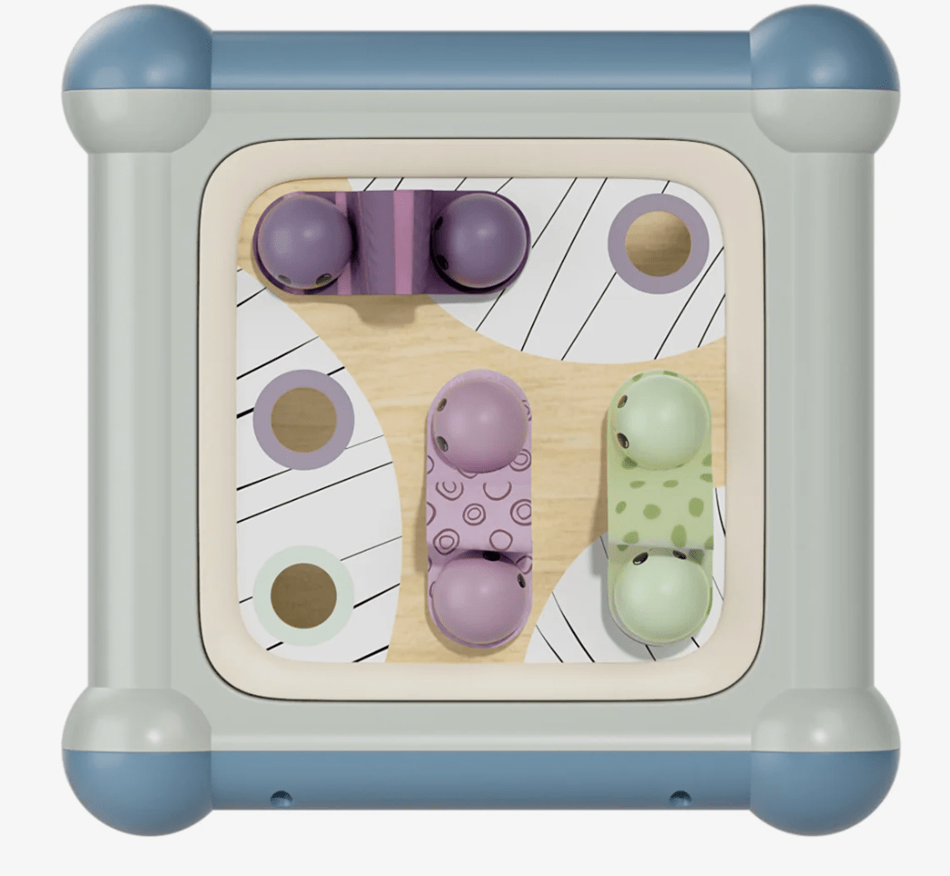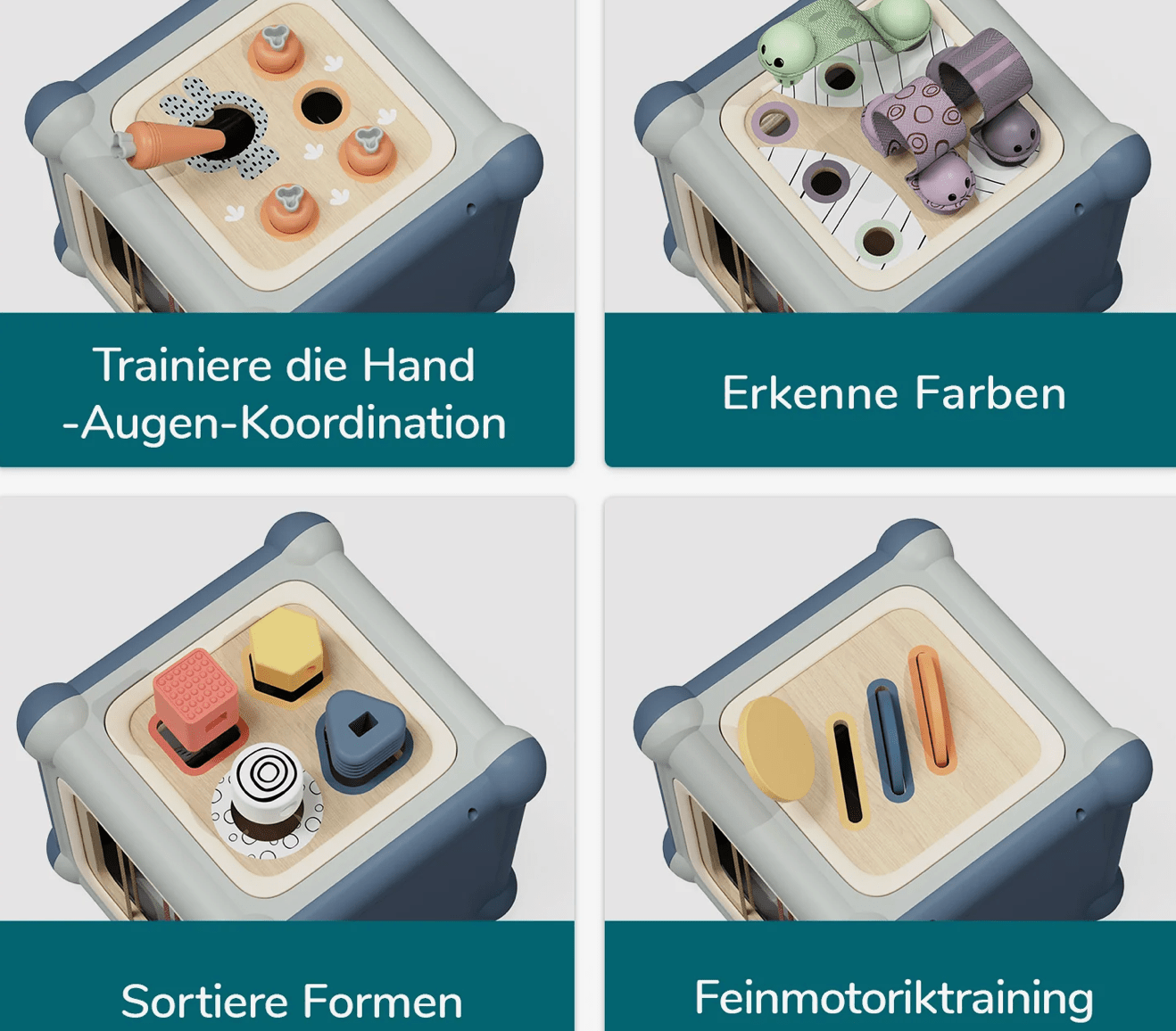 Ob Kugelrutsche, Spiegel, Fädelspiel, Formensortierer, Karotten- und Wurmspiel, Münzeinwurf, Zahnräder, Zugspiel oder elastische Gummibänder – jede Seite des Würfels sorgt für neue Herausforderungen. Das Besondere: Die einzelnen Spielseiten sind austauschbar und lassen sich individuell an die Entwicklungsstufe des Kindes anpassen. So wächst der Würfel mit und bleibt immer spannend!