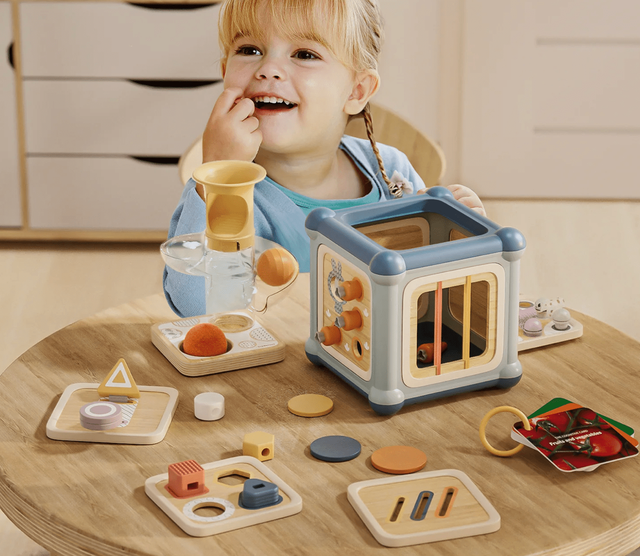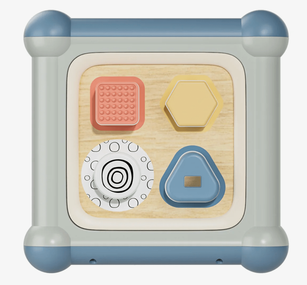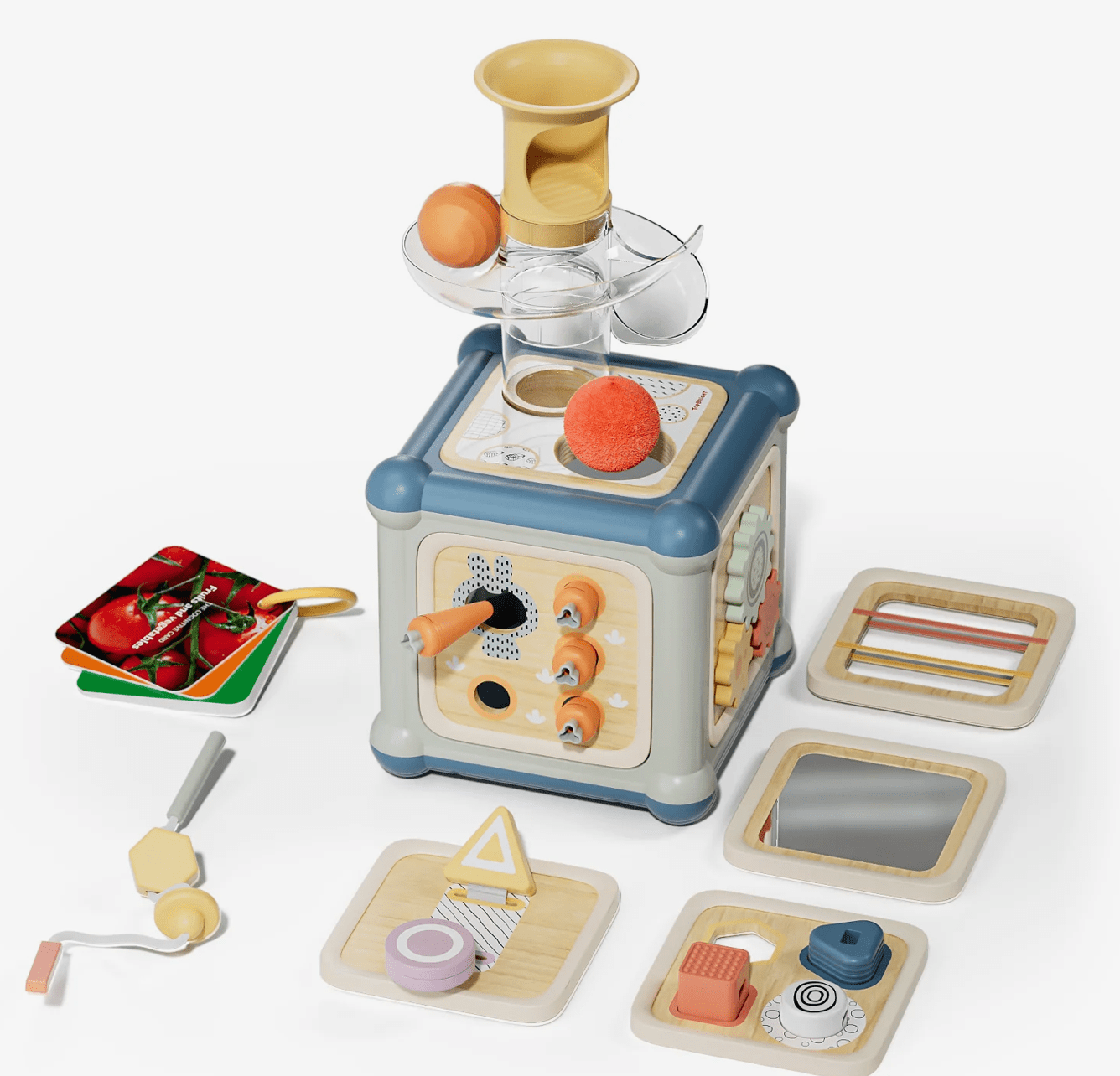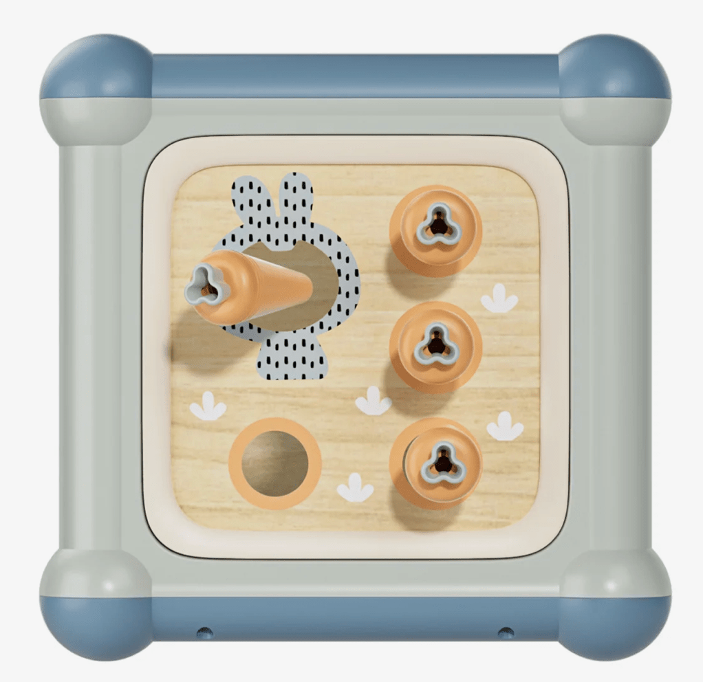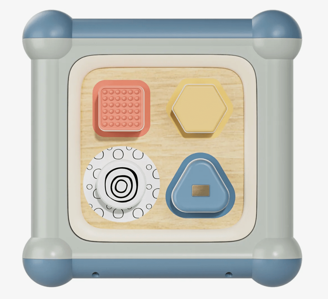 Ob Kugelrutsche, Spiegel, Fädelspiel, Formensortierer, Karotten- und Wurmspiel, Münzeinwurf, Zahnräder, Zugspiel oder elastische Gummibänder – jede Seite des Würfels sorgt für neue Herausforderungen. Das Besondere: Die einzelnen Spielseiten sind austauschbar und lassen sich individuell an die Entwicklungsstufe des Kindes anpassen. So wächst der Würfel mit und bleibt immer spannend!