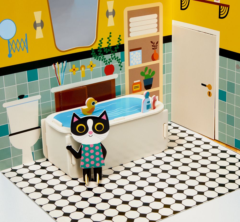 - Figuren und Möbel lassen sich heraustrennnen, aufstellen und frei im Puppenhaus arrangieren – Kinder gestalten ihre eigene Spielwelt.